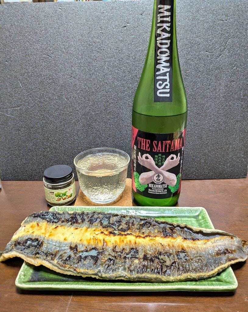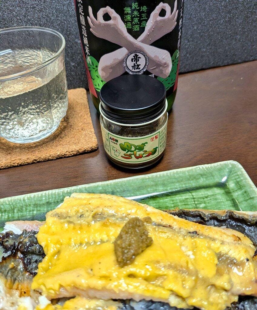 うなぎに柚子胡椒をのせて、日本酒を・・・。